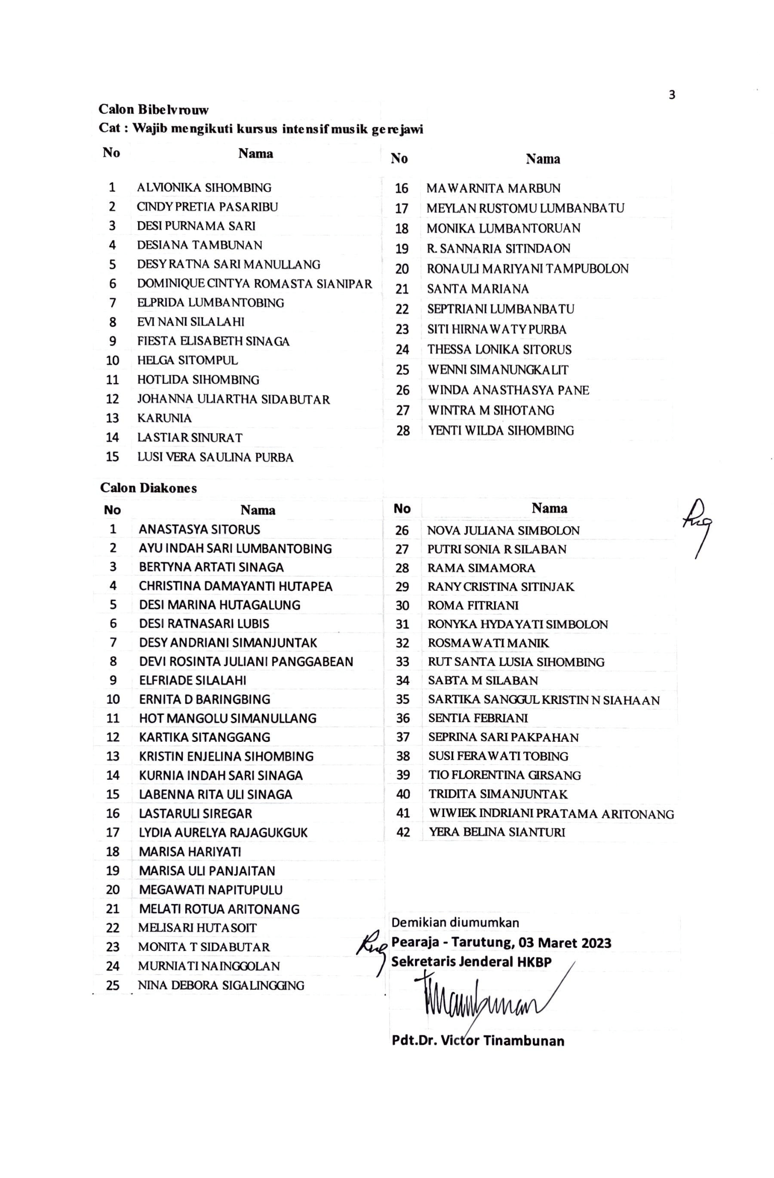 HKBP Meluluskan 136 Calon Pendeta, 33 Calon Guru Huria, 28 Calon Biblevrouw, 42 Calon Diakones. Hal ini sesuai dengan hasil ujian tes penerimaan bakal calon pelayan HKBP pada tanggal 26 Februari – 02 Maret 2023 dan keputusan rapat pimpinan HKBP tanggal 03 Maret 2023 perihal hasil ujian tes penerimaan bakal calon pelayan HKBP.