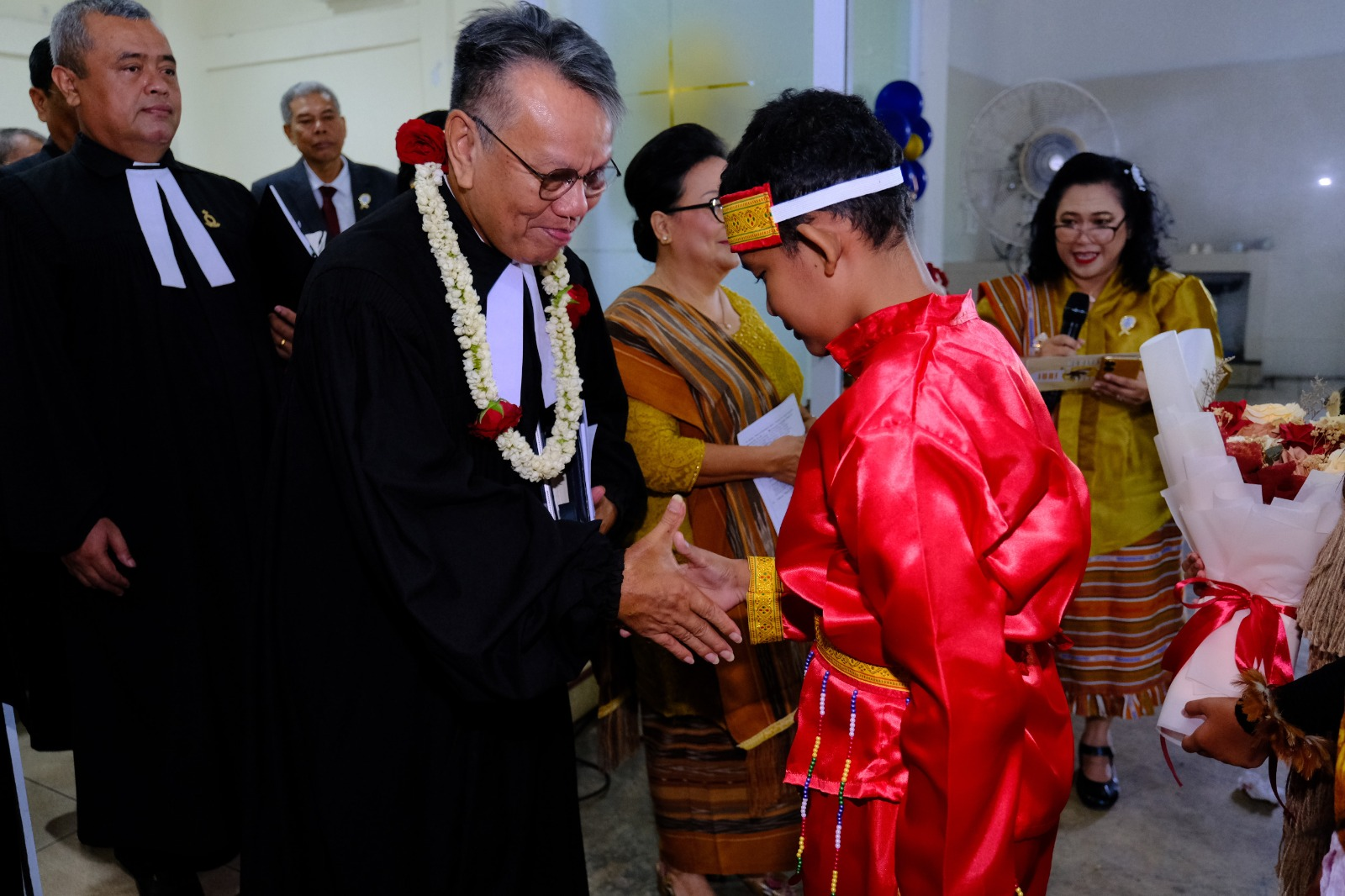 Pengalungan Bunga kepada Pendeta Resort HKBP Wakaras Pdt. Ridwan Silitonga, S.Th., yang diberikan Anaks Sekolah Minggu HKBP Warakas.