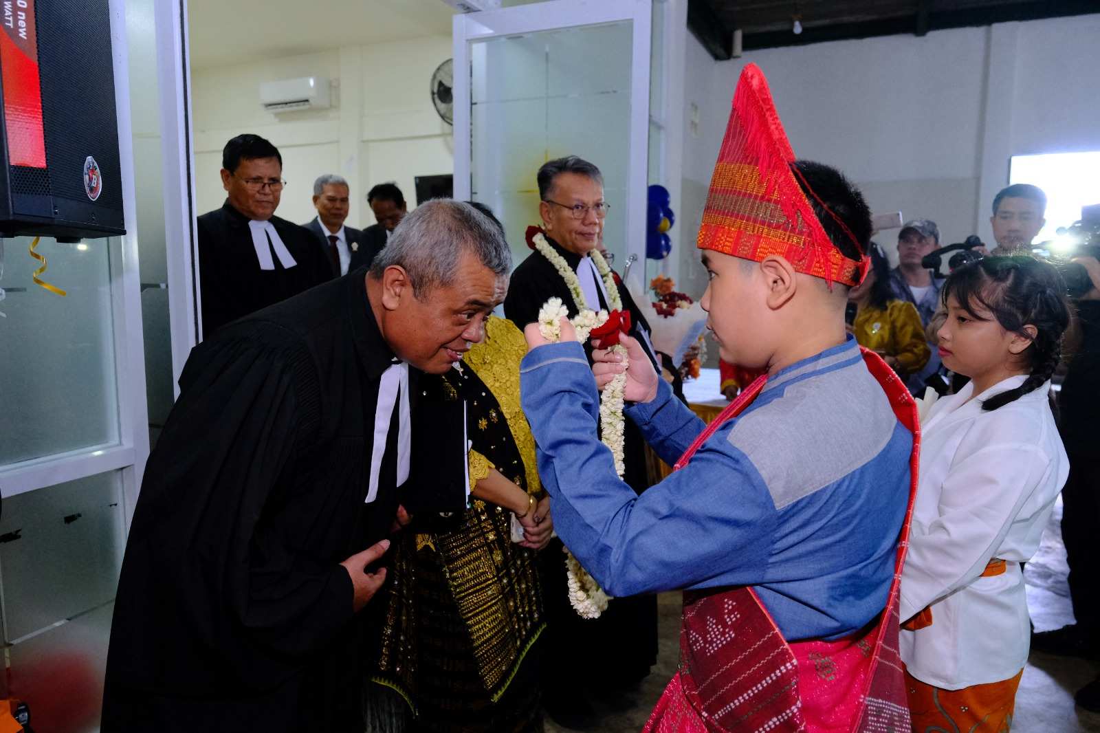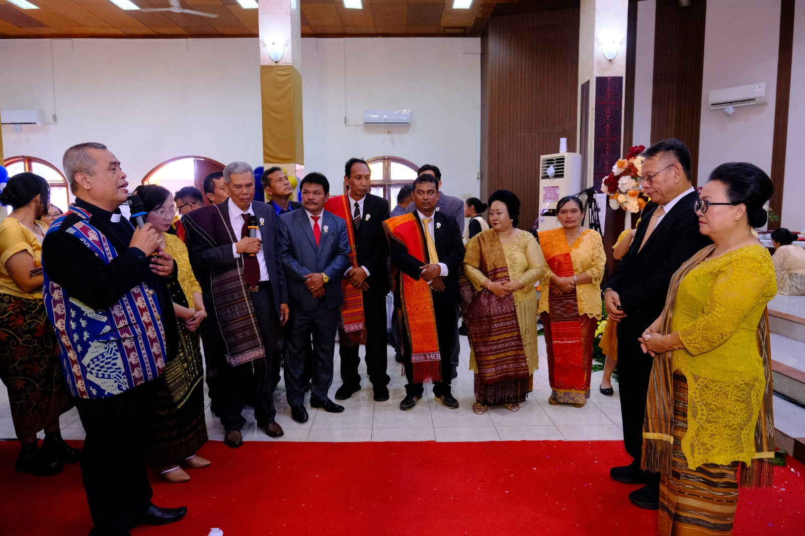 Prosesi ibadah berlangsung khidmat saat rombongan pelayan memasuki gedung gereja dengan membawa simbol Alkitab, lilin, dan salib. Kehadiran mereka disambut tarian tortor serta pujian dari gabungan koor yang menambah kekhusyukan suasana ibadah.