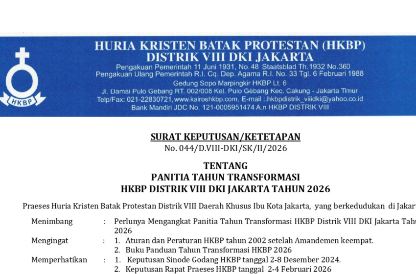 Jakarta, 22 Februari 2026 — Pelantikan Panitia Tahun Transformasi HKBP Distrik VIII DKI Jakarta berlangsung di HKBP Pasar Minggu pada Minggu Invocavit (22/2/2026). Ibadah yang dimulai pukul 10.00 WIB ini dipimpin langsung oleh Praeses Distrik VIII DKI Jakarta, Pdt. Oloan Nainggolan, S.Th.