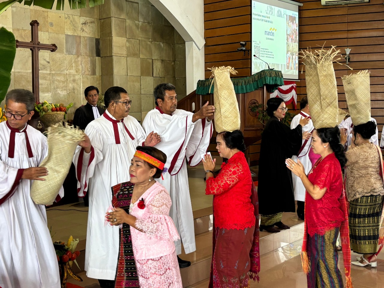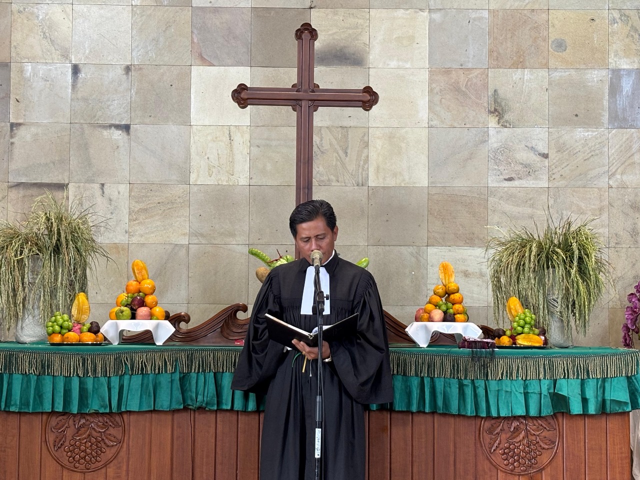 Ibadah berlangsung di gereja HKBP Pasar Minggu, Jakarta Selatan, dengan tema, ‘Membawa hasil panen terbaik untuk kemuliaan Tuhan,’ berdasarkan Amsal 3:9-10. Subtema, ‘Sebagai bukti iman dan pengabdian kepada Tuhan, Jemaat HKBP Pasar Minggu dengan sukacita mempersembahkan yang terbaik kepada Tuhan dari penghasilan yang diterima dari Tuhan.