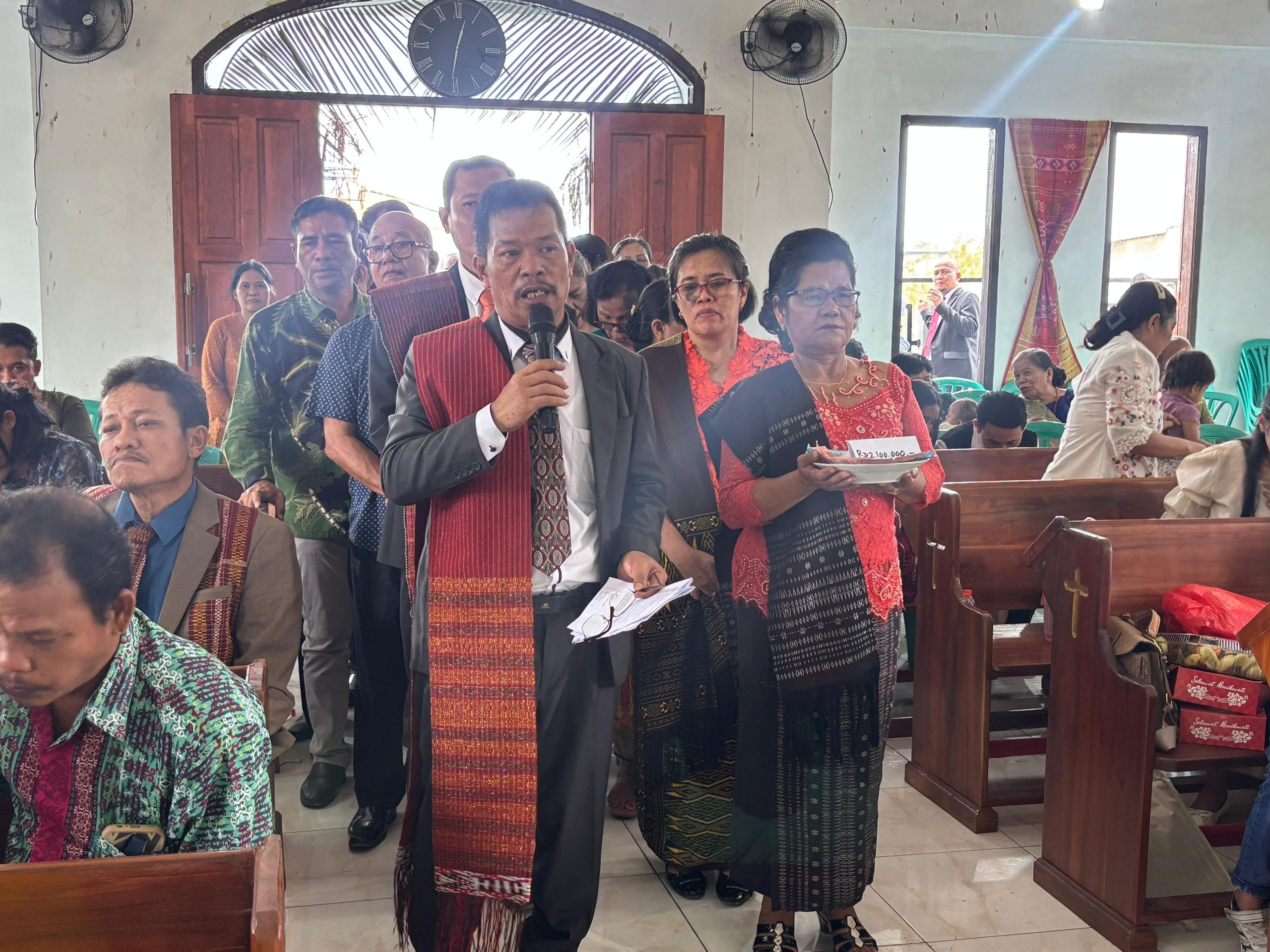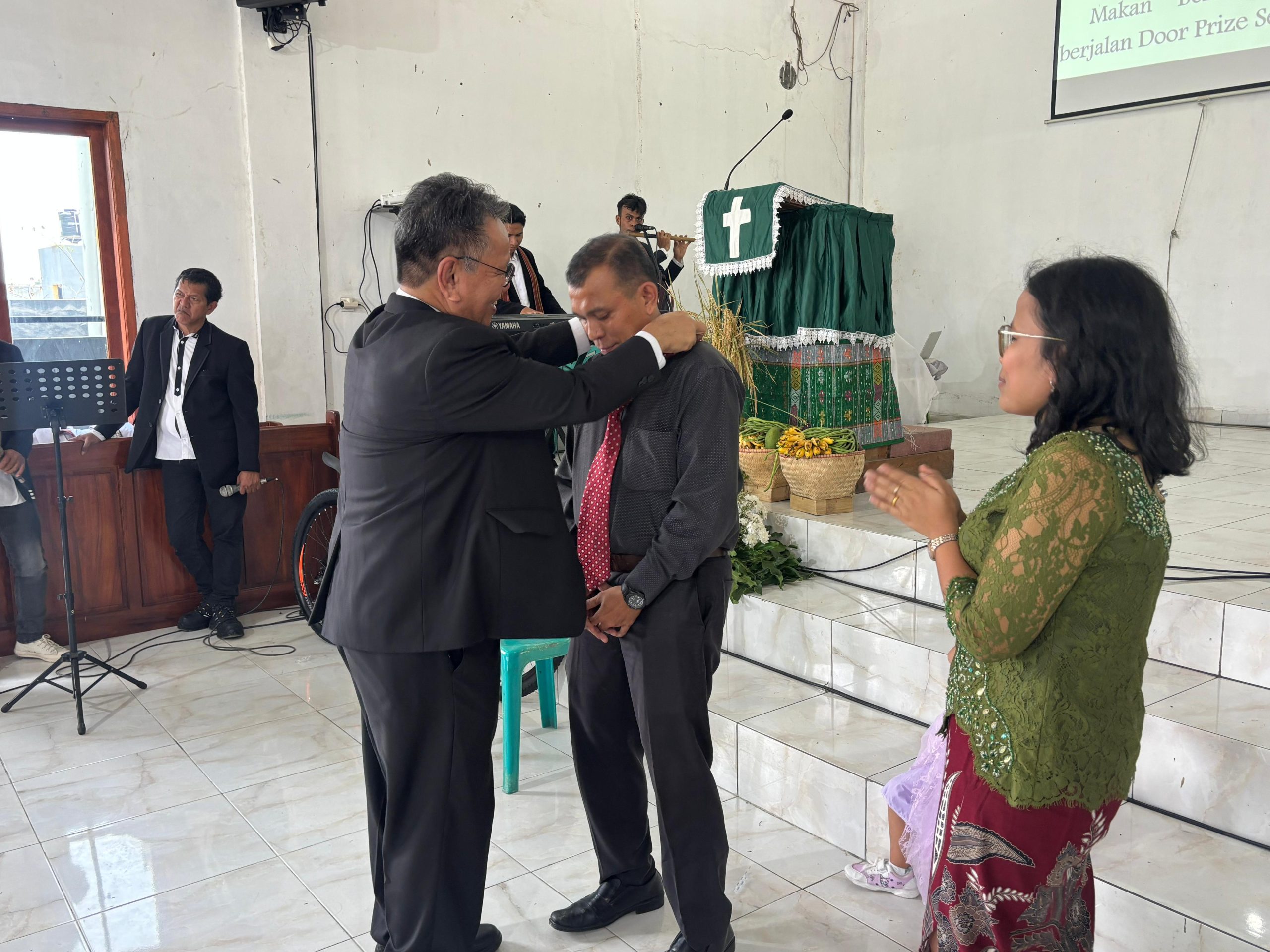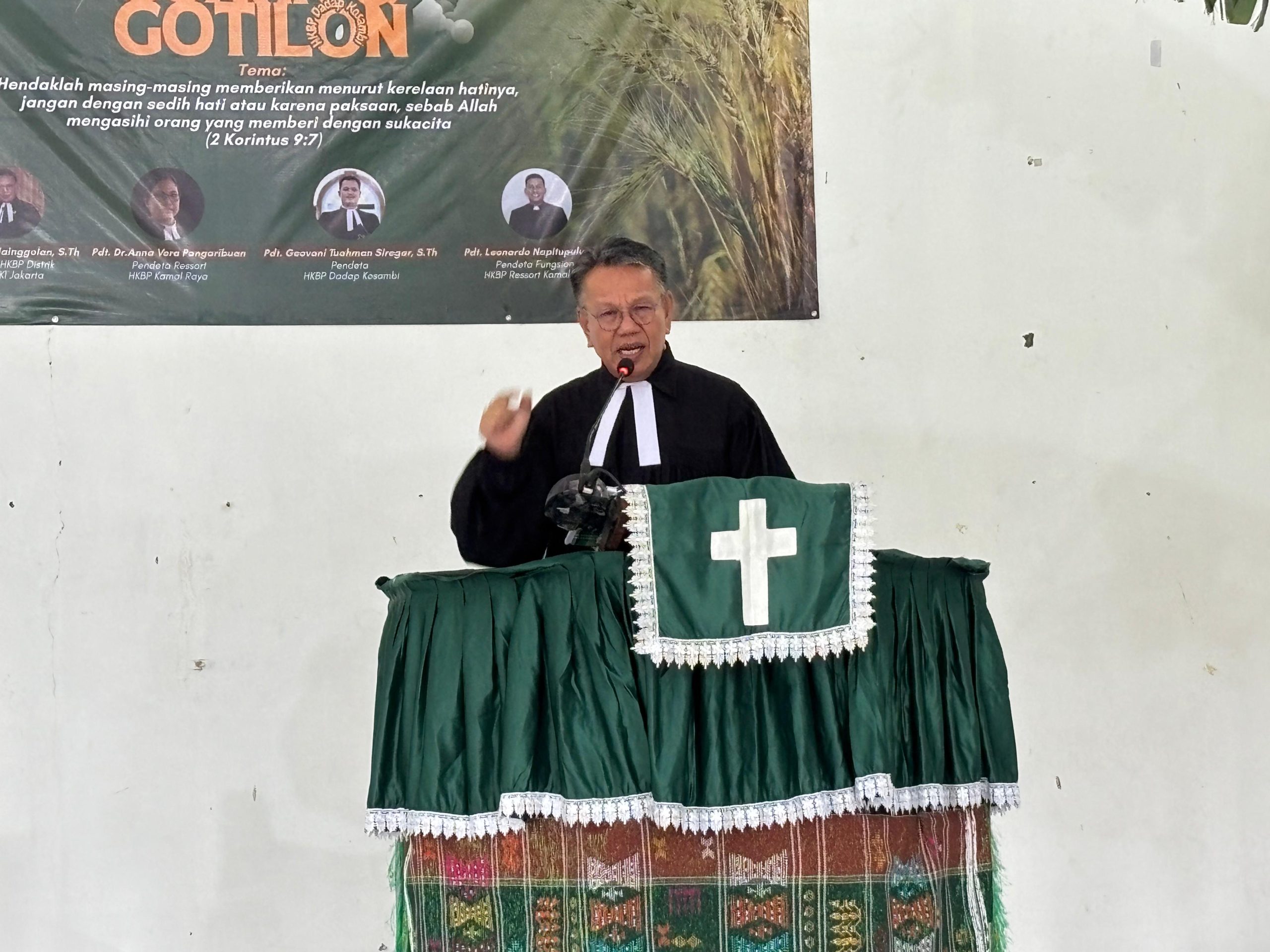 Praeses HKBP Distrik VIII DKI Jakarta, Pdt. Oloan Nainggolan, S.Th., memimpin ibadah Pesta Gotilon dan Penggalangan Dana Pembangunan HKBP Dadap Kosambi Resort HKBP Kamal Raya, Minggu (5/10/2025). Dalam acara ini, praeses didampingi Pdt. Dr. Anna Vera Ch. Pangaribuan sebagai Pendeta Resort Kamal Raya, serta pendeta fungsional, Pdt. Geovani Tuahman Siregar S.Th.